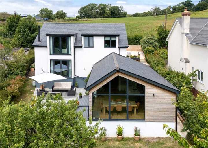 Using the topography of the site, the property has a split level accommodation, with a two storey section at the front of the site, with a single storey vaulted section at a lower level, making the most of the views to the rear and access to the rear garden.